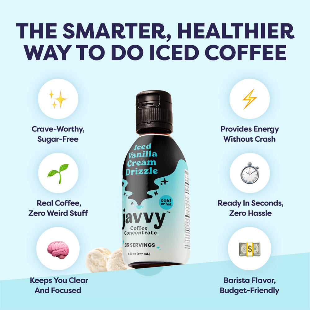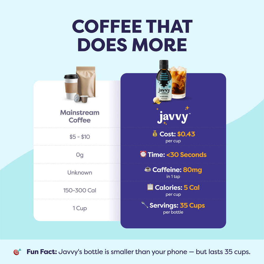 Javvy Coffee Concentrate is the fastest, easiest way to enjoy better coffee - without the sugar, hassle, or compromise. Javvy Coffee Concentrate delivers 100% real coffee with naturally derived ingredients, zero sugar, and no artificial flavors, all in a variety of crave-worthy options. With 60mg of caffeine per serving, each bottle brews up 35 rich, satisfying cups — hot or iced — in seconds. It’s gluten-free and guilt-free, so you can indulge in better-tasting coffee, faster. With this bundle, you’ll also receive a recipe booklet featuring our customers’ favorite creations.