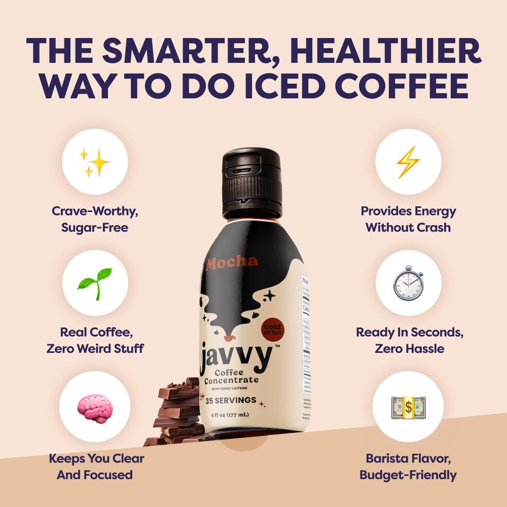 Javvy Coffee Concentrate is the fastest, easiest way to enjoy better coffee - without the sugar, hassle, or compromise. Javvy Coffee Concentrate delivers 100% real coffee with naturally derived ingredients, zero sugar, and no artificial flavors, all in a variety of crave-worthy options. With 80mg of caffeine per serving, each bottle brews up 35 rich, satisfying cups — hot or iced — in seconds. It’s gluten-free and guilt-free, so you can indulge in better-tasting coffee, faster. With this bundle, you’ll also receive a recipe booklet featuring our customers’ favorite creations.