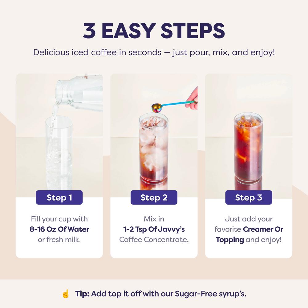 Javvy Coffee Concentrate is the fastest, easiest way to enjoy better coffee - without the sugar, hassle, or compromise. Javvy Coffee Concentrate delivers 100% real coffee with naturally derived ingredients, zero sugar, and no artificial flavors, all in a variety of crave-worthy options. With 60mg of caffeine per serving, each bottle brews up 35 rich, satisfying cups — hot or iced — in seconds. It’s gluten-free and guilt-free, so you can indulge in better-tasting coffee, faster. With this bundle, you’ll also receive a recipe booklet featuring our customers’ favorite creations.