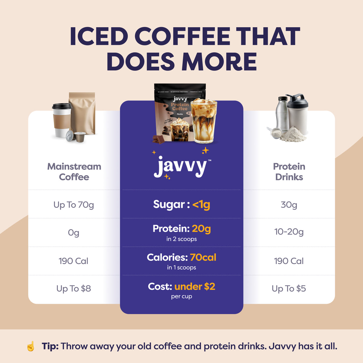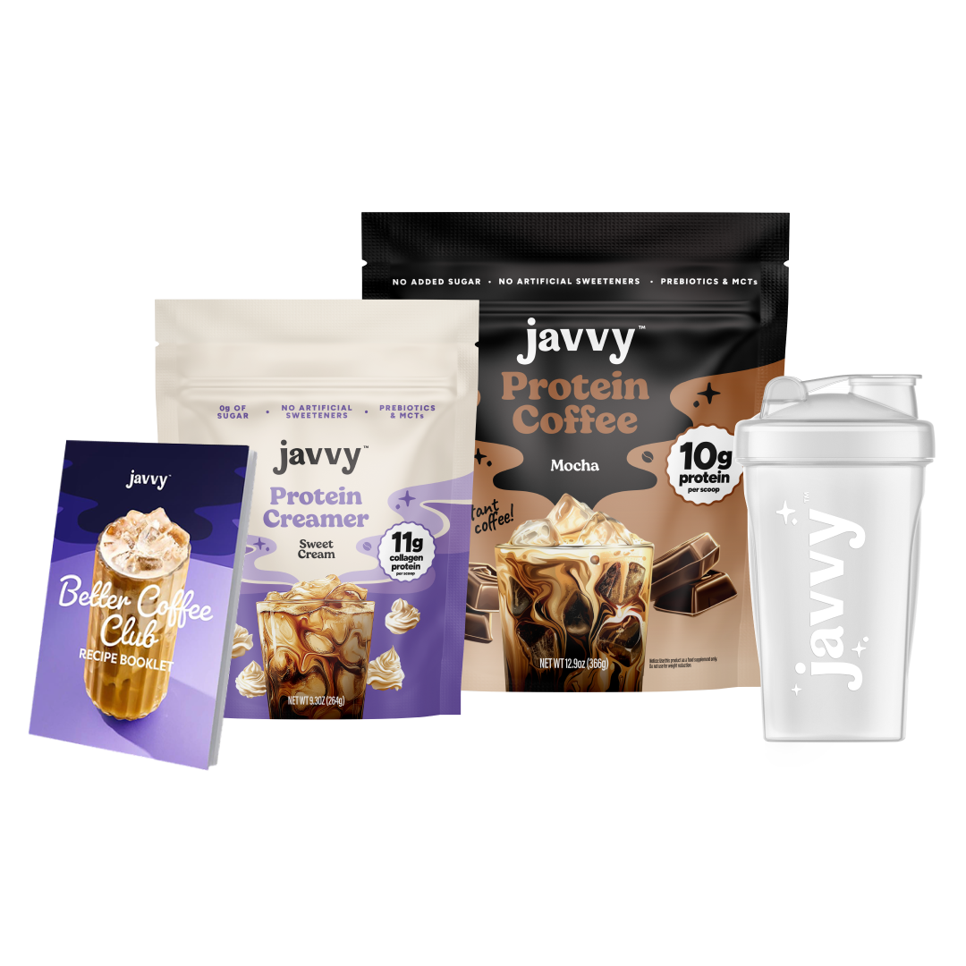 Experience the easiest, most delicious way to kick-start your day while reaching your health goals! With 10g of protein, prebiotics, and MCTs, Javvy Protein Coffee delivers a crave-worthy blend of flavor and nutrition — crafted with quality ingredients, no artificial sweeteners, and less than 1g of naturally occurring sugar from Whey Protein. With this bundle, you’ll also receive a FREE Shaker Bottle for crafting the perfect Iced Protein Coffee in seconds, a recipe booklet featuring our customers’ favorite creations, and a bag of our indulgent Sweet Cream Protein Creamer.