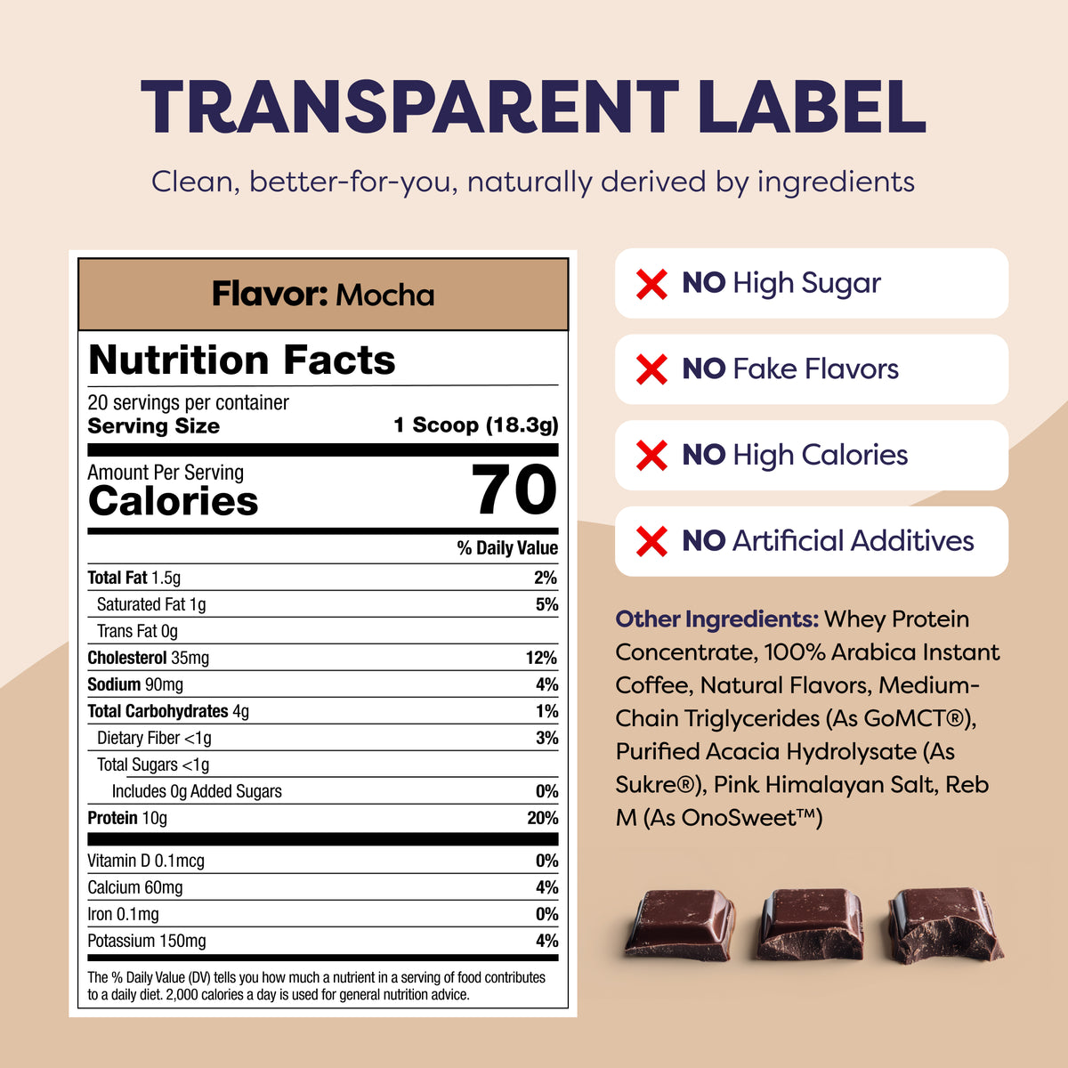 Whey Protein Concentrate, 100% Arabica Instant Coffee, Natural Flavors, Purified Acacia Hydrolysate (as Sukre®), Medium-Chain Triglycerides (as goMCT®), Pink Himalayan Salt, Reb M (as OnoSweet™)
