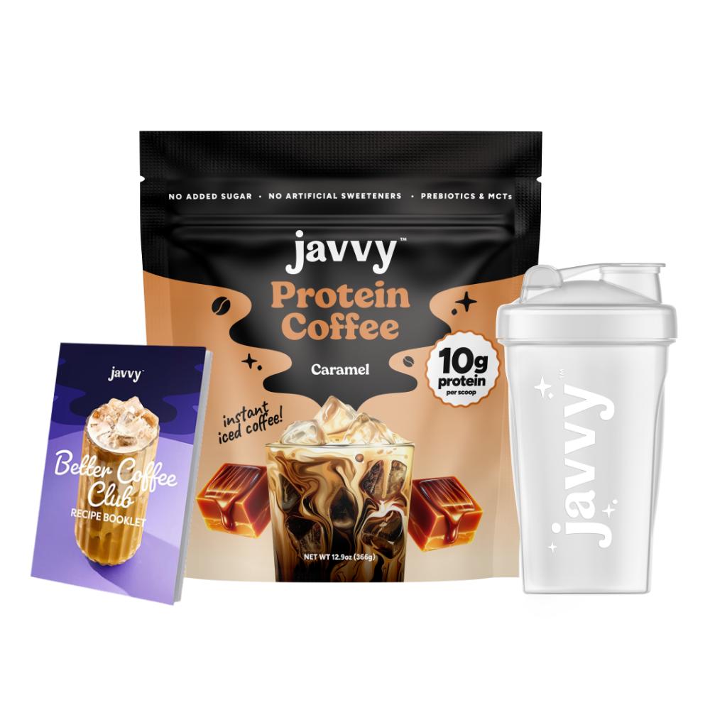 Experience the easiest, most delicious way to kick-start your day while reaching your health goals! With 10g of protein, prebiotics, and MCTs, Javvy Protein Coffee delivers a crave-worthy blend of flavor and nutrition — crafted with quality ingredients, no artificial sweeteners, and less than 1g of naturally occurring sugar from Whey Protein. With this bundle, you’ll also receive a FREE Shaker Bottle to help you craft the perfect iced coffee in seconds, and a recipe booklet featuring our customers’ favorite creations.