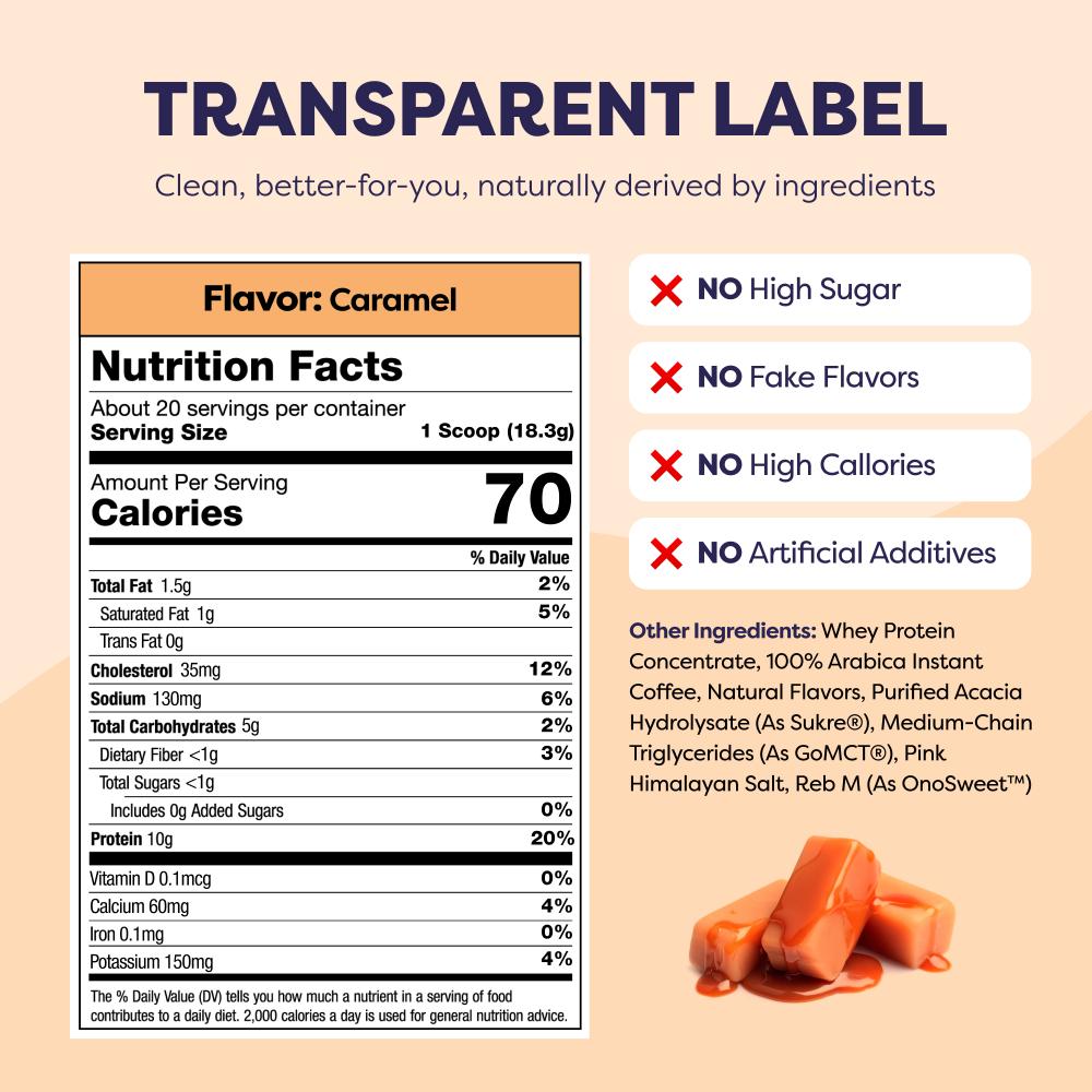 Whey Protein Concentrate, 100% Arabica Instant Coffee, Natural Flavors, Purified Acacia Hydrolysate (as Sukre®), Medium-Chain Triglycerides (as goMCT®), Pink Himalayan Salt, Reb M (as OnoSweet™)