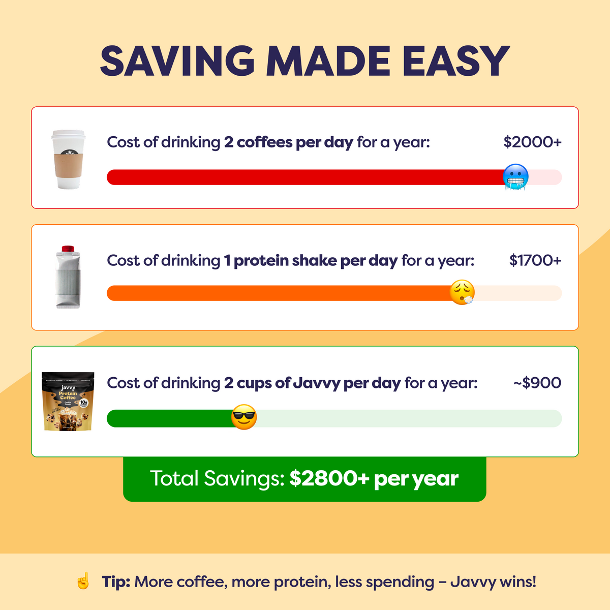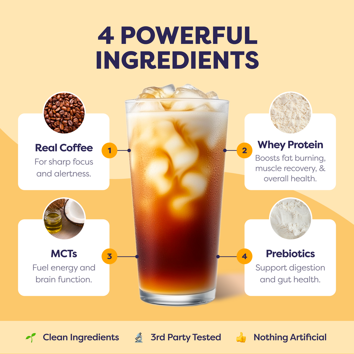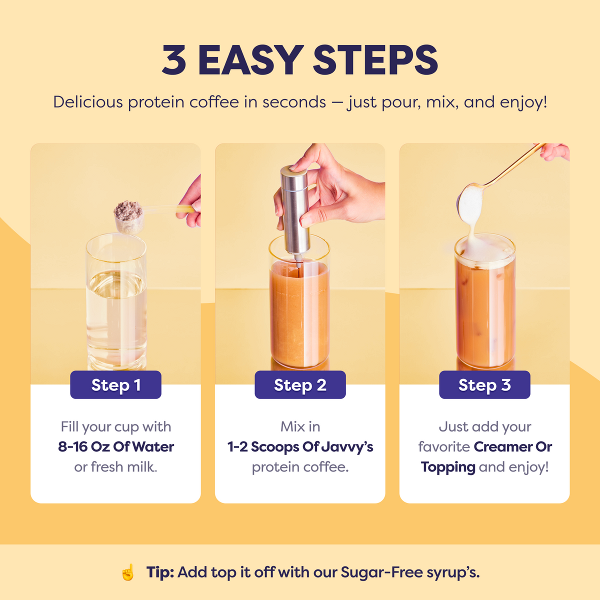 Experience the easiest, most delicious way to kick-start your day while reaching your health goals! With 10g of protein, prebiotics, and MCTs, Javvy Protein Coffee delivers a crave-worthy blend of flavor and nutrition — crafted with quality ingredients, no artificial sweeteners, and less than 1g of naturally occurring sugar from Whey Protein. With this bundle, you’ll also receive a FREE Shaker Bottle to help you craft the perfect iced coffee in seconds, and a recipe booklet featuring our customers’ favorite creations.
