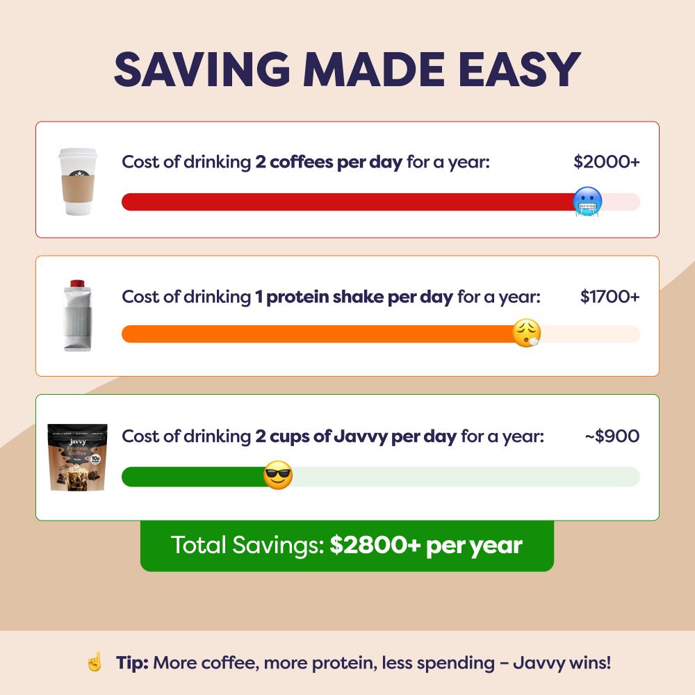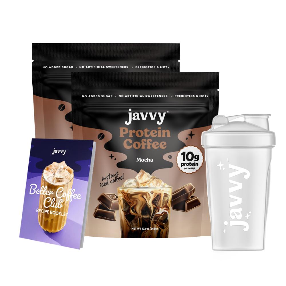 Experience the easiest, most delicious way to kick-start your day while reaching your health goals! With 10g of protein, prebiotics, and MCTs, Javvy Protein Coffee delivers a crave-worthy blend of flavor and nutrition — crafted with quality ingredients, no artificial sweeteners, and less than 1g of naturally occurring sugar from Whey Protein. With this bundle, you’ll also receive a FREE Shaker Bottle for crafting the perfect Iced Protein Coffee in seconds, and a recipe booklet featuring our customers’ favorite creations.