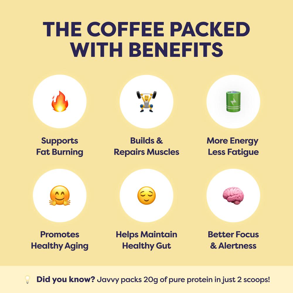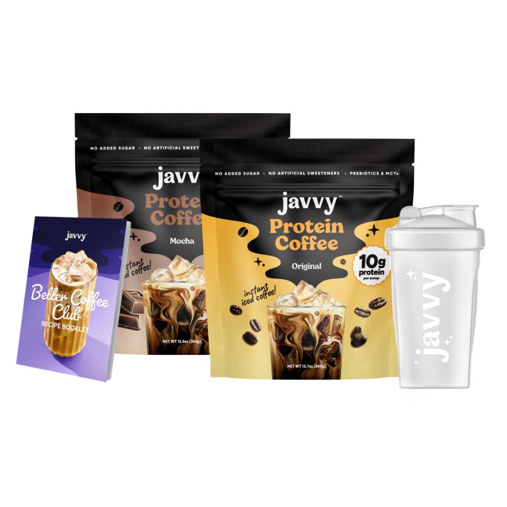 Experience the easiest, most delicious way to kick-start your day while reaching your health goals! With 10g of protein, prebiotics, and MCTs, Javvy Protein Coffee delivers a crave-worthy blend of flavor and nutrition — crafted with quality ingredients, no artificial sweeteners, and less than 1g of naturally occurring sugar from Whey Protein. With this bundle, you’ll also receive a FREE Shaker Bottle for crafting the perfect Iced Protein Coffee in seconds, and a recipe booklet featuring our customers’ favorite creations.