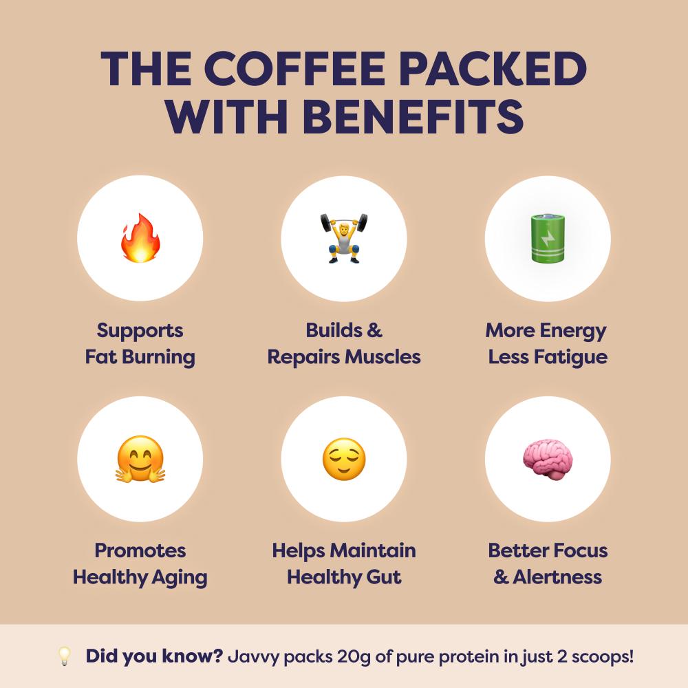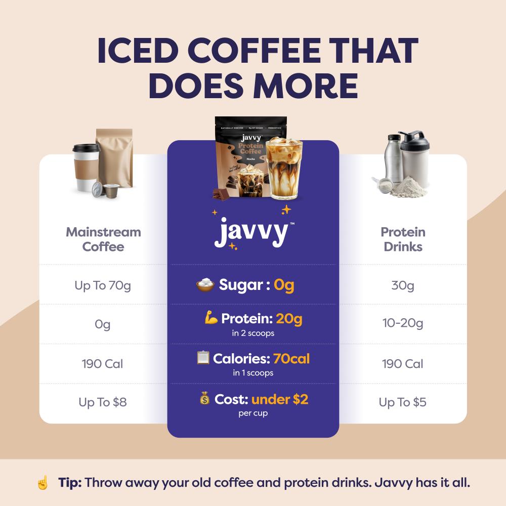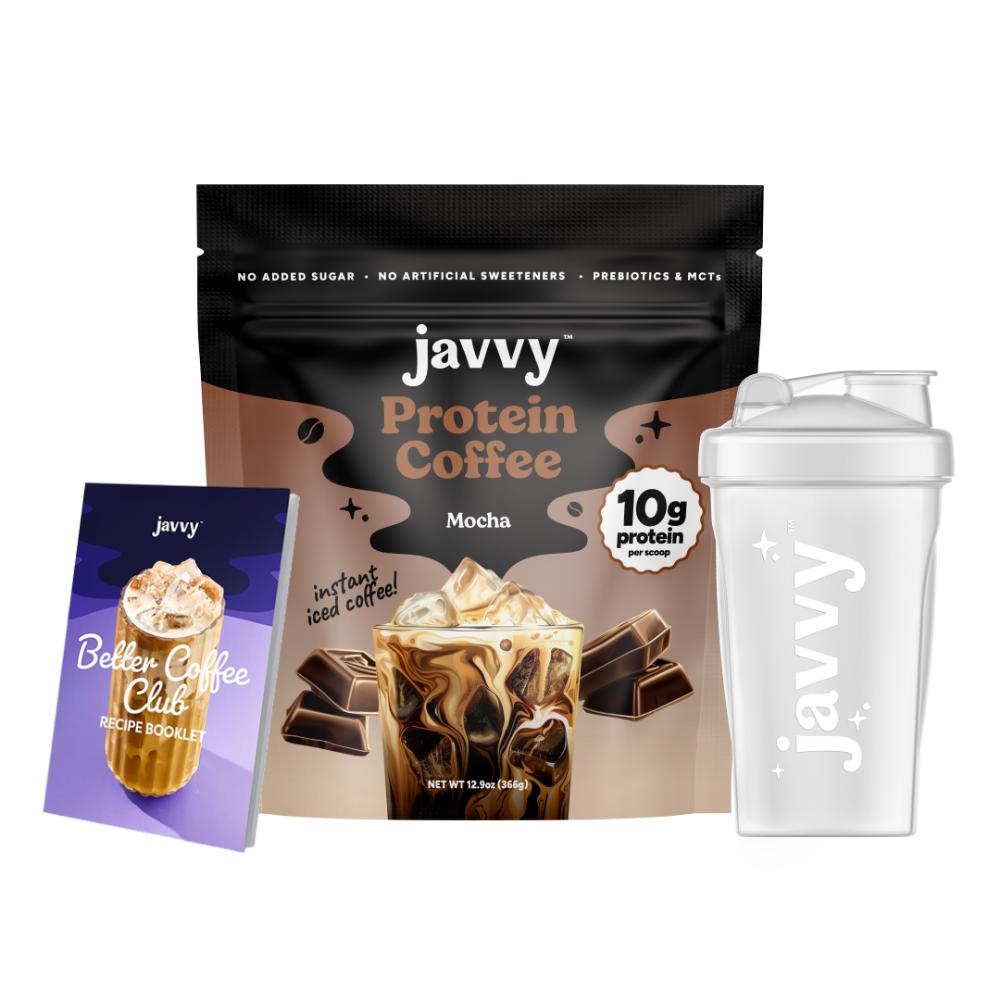 Experience the easiest, most delicious way to kick-start your day while reaching your health goals! With 10g of protein, prebiotics, and MCTs, Javvy Protein Coffee delivers a crave-worthy blend of flavor and nutrition — crafted with quality ingredients, no artificial sweeteners, and less than 1g of naturally occurring sugar from Whey Protein. With this bundle, you’ll also receive a FREE Shaker Bottle to help you craft the perfect iced coffee in seconds, and a recipe booklet featuring our customers’ favorite creations.