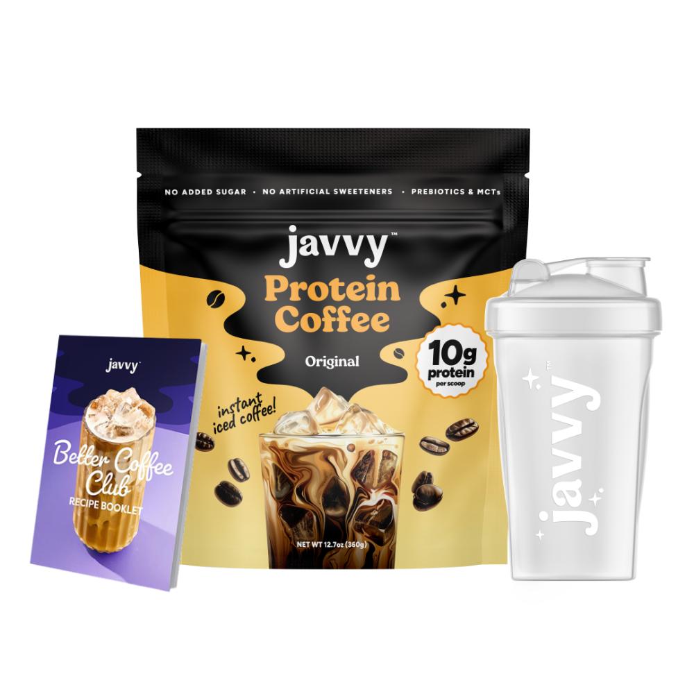 Experience the easiest, most delicious way to kick-start your day while reaching your health goals! With 10g of protein, prebiotics, and MCTs, Javvy Protein Coffee delivers a crave-worthy blend of flavor and nutrition — crafted with quality ingredients, no artificial sweeteners, and less than 1g of naturally occurring sugar from Whey Protein. With this bundle, you’ll also receive a FREE Shaker Bottle to help you craft the perfect iced coffee in seconds, and a recipe booklet featuring our customers’ favorite creations.