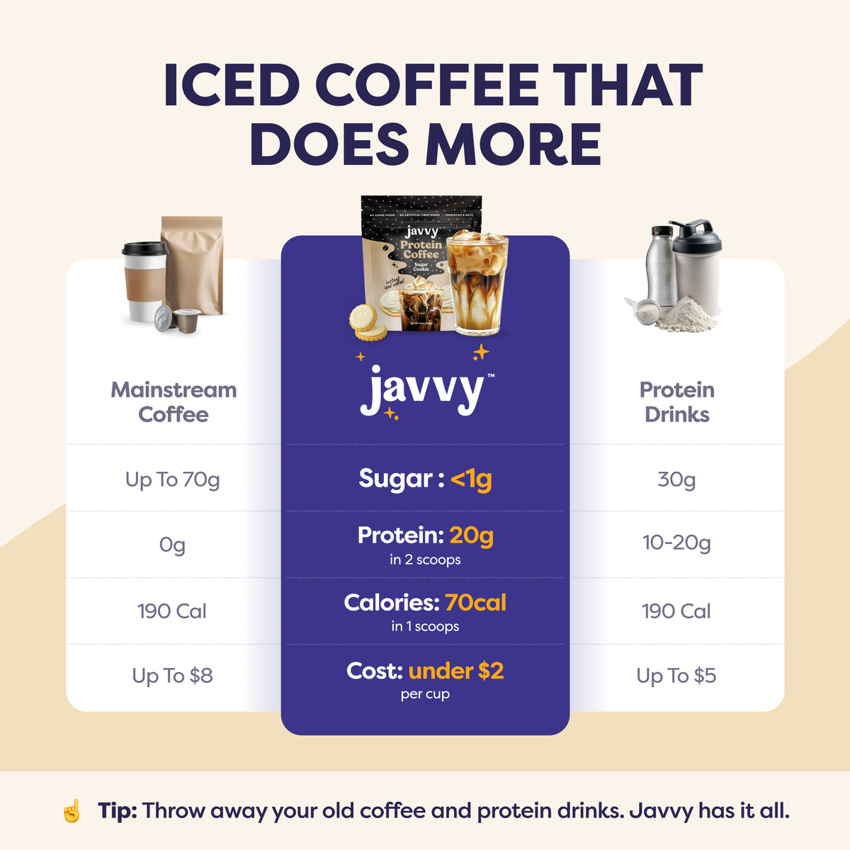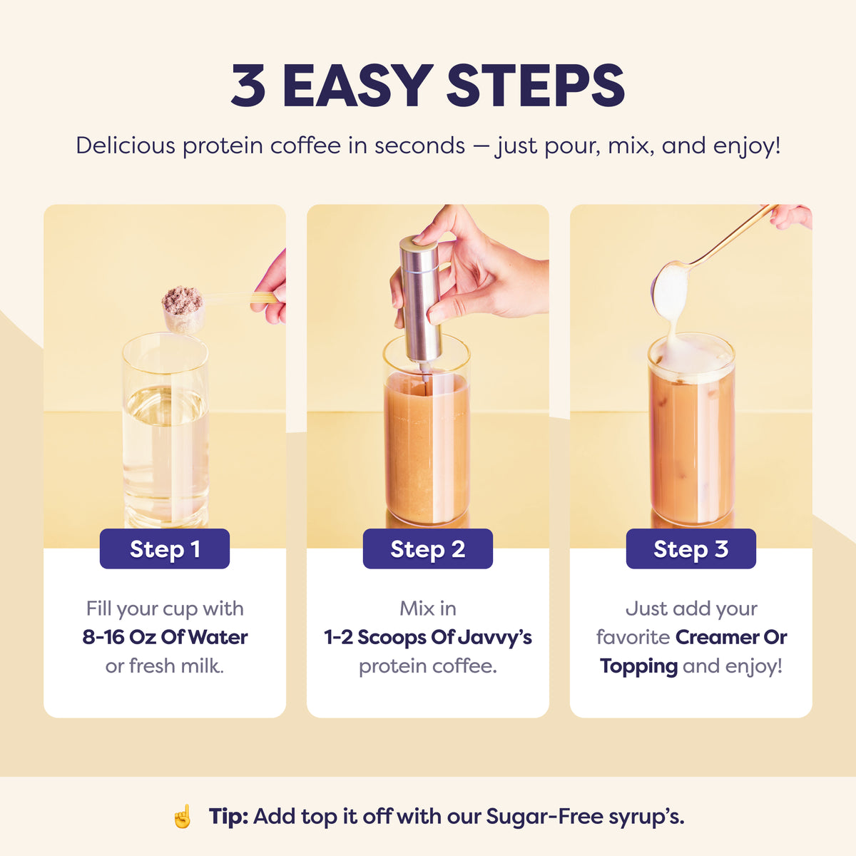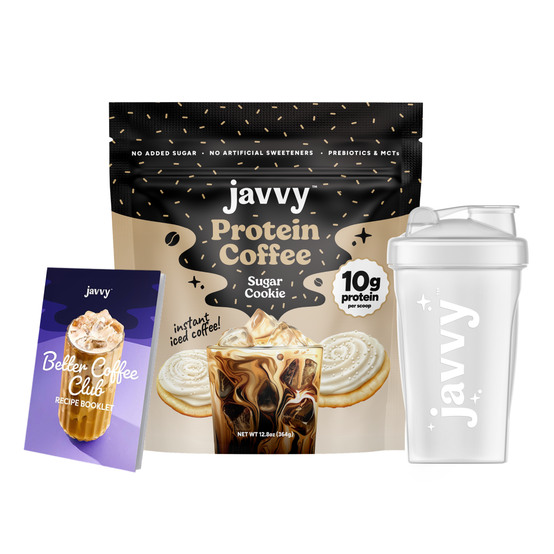 Experience the easiest, most delicious way to kick-start your day while reaching your health goals! With 10g of protein, prebiotics, and MCTs, Javvy Protein Coffee delivers a crave-worthy blend of flavor and nutrition — crafted with quality ingredients, no artificial sweeteners, and less than 1g of naturally occurring sugar from Whey Protein. With this bundle, you’ll also receive a FREE Shaker Bottle to help you craft the perfect iced coffee in seconds, and a recipe booklet featuring our customers’ favorite creations.