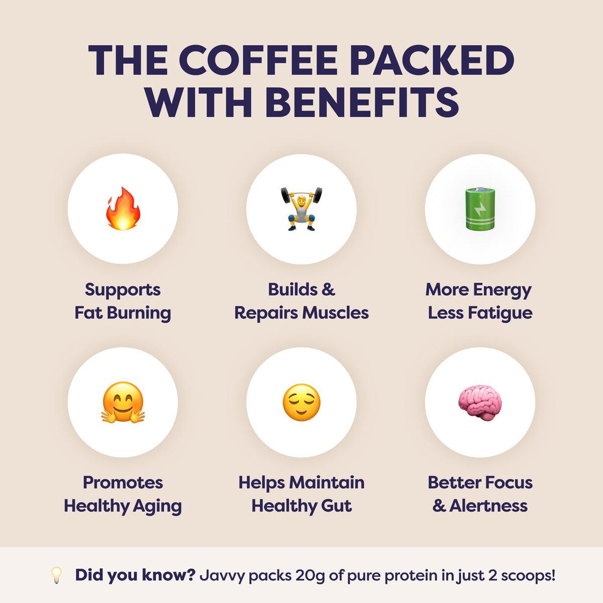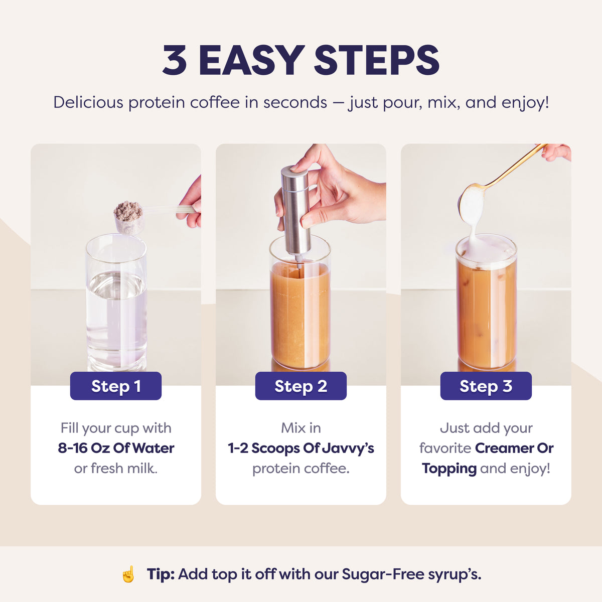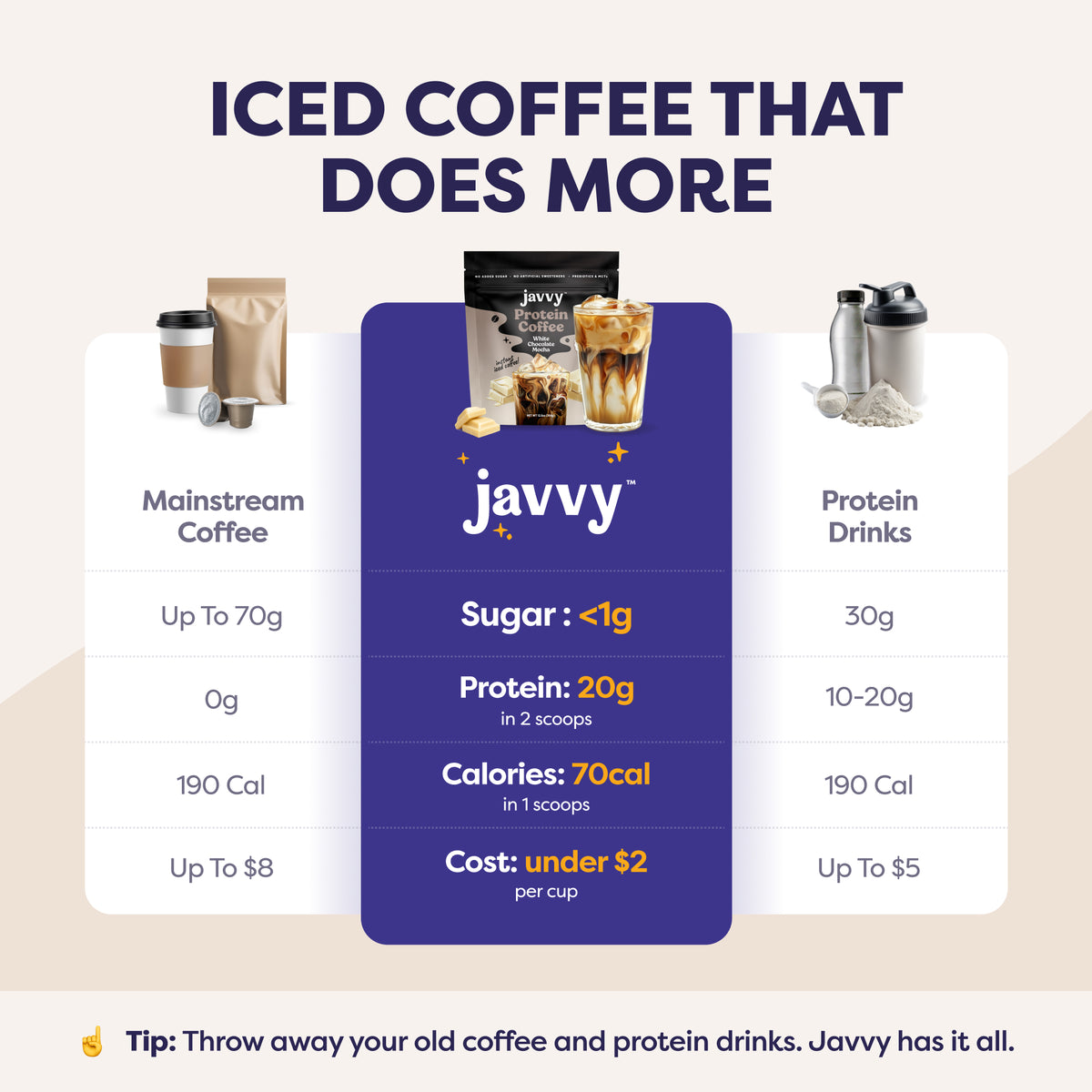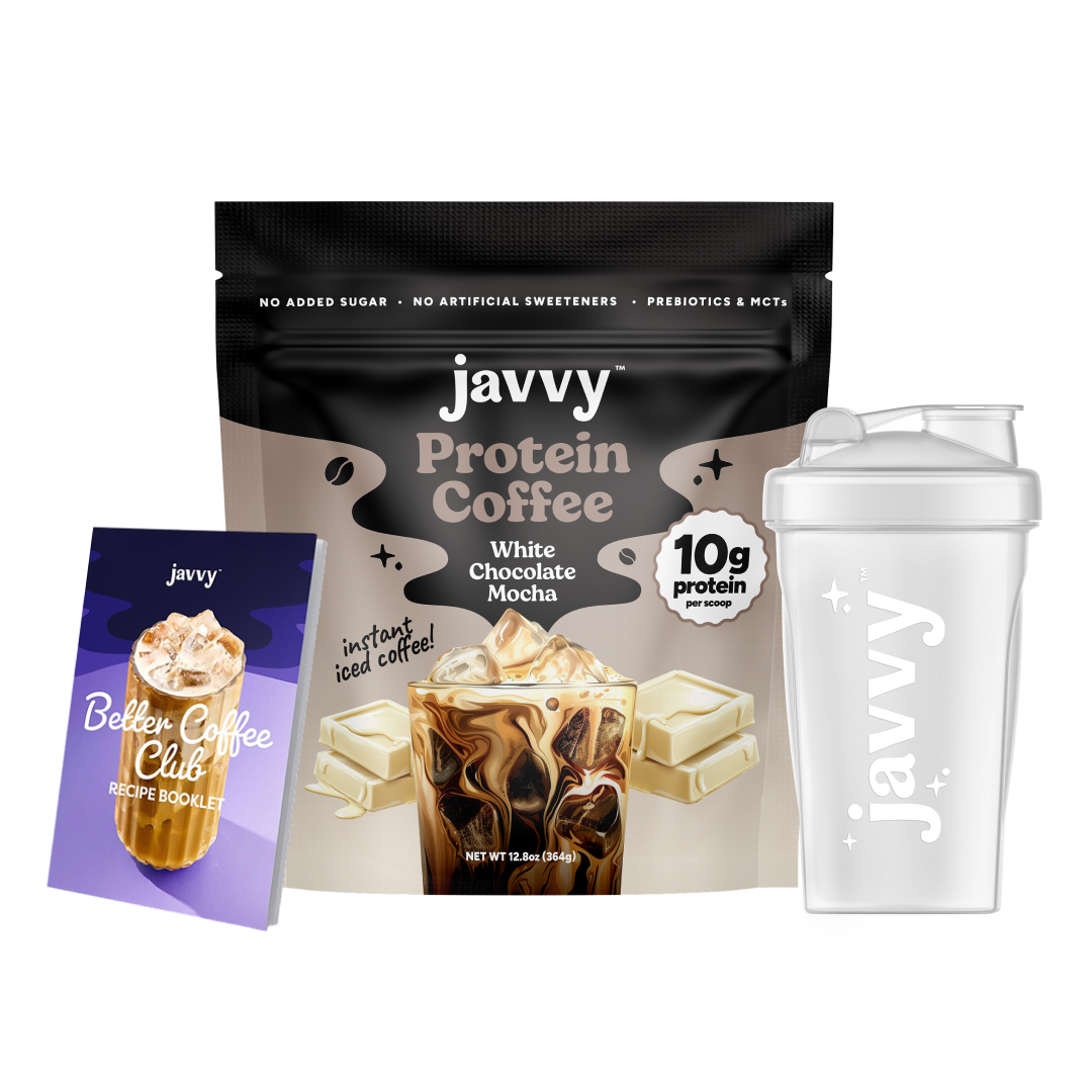 Experience the easiest, most delicious way to kick-start your day while reaching your health goals! With 10g of protein, prebiotics, and MCTs, Javvy Protein Coffee delivers a crave-worthy blend of flavor and nutrition — crafted with quality ingredients, no artificial sweeteners, and less than 1g of naturally occurring sugar from Whey Protein. With this bundle, you’ll also receive a FREE Shaker Bottle to help you craft the perfect iced coffee in seconds, and a recipe booklet featuring our customers’ favorite creations.