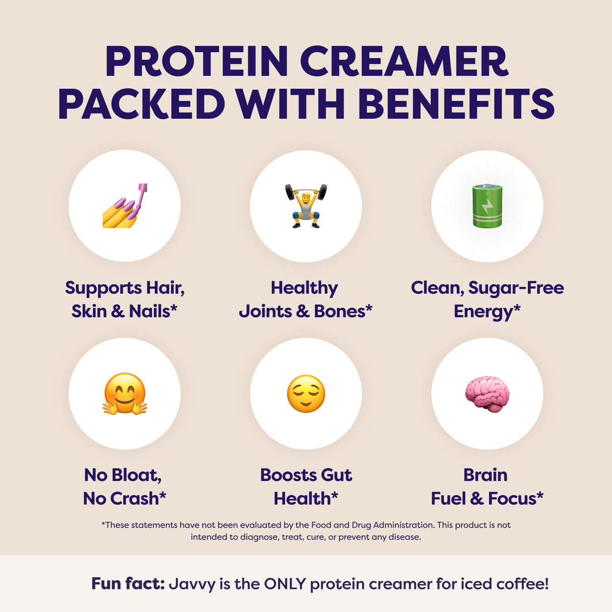 Give your daily coffee routine a rich, superfood boost with one simple scoop. Our delicious Protein Creamer combines functional ingredients with indulgent flavor, so every cup feels like a treat while fueling your body with real benefits. Each serving delivers 11g of collagen protein per scoop to support strong hair, skin, nails, joints, and bones, making it more than just a creamer—it’s a daily wellness ritual. With 0g of sugar and no artificial sweeteners, you get better-for-you creamer without the crash. We’ve added prebiotics and MCTs to help support gut health and provide sustained fuel for focus and performance throughout the day. Just mix, sip, and enjoy your upgraded coffee. With this bundle you’ll also receive a FREE Shaker Bottle and a Recipe Booklet featuring our customers’ favorite creations.
