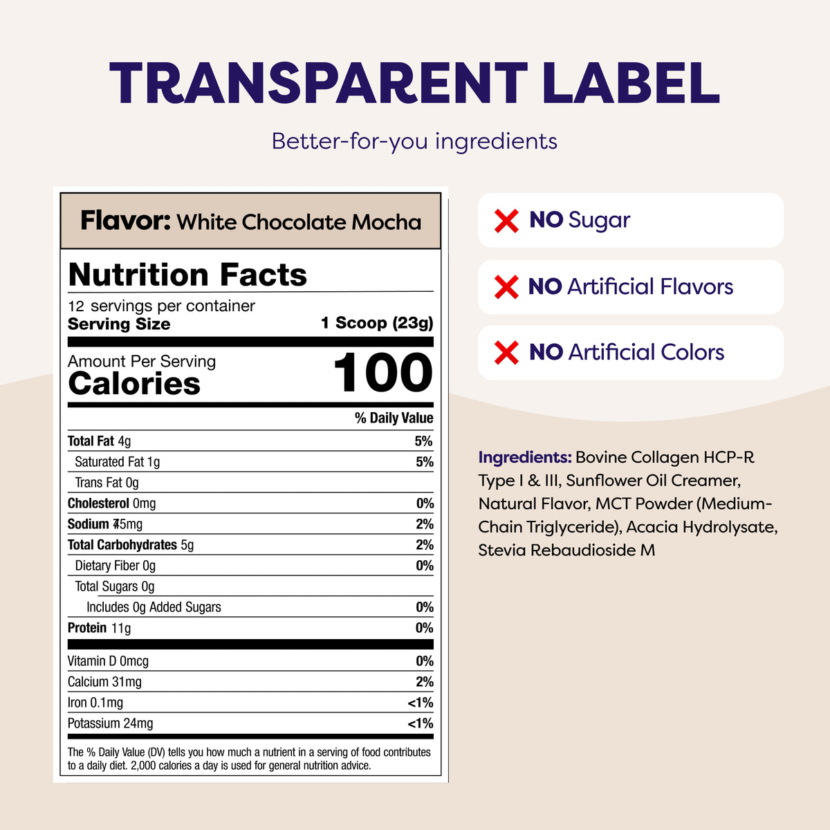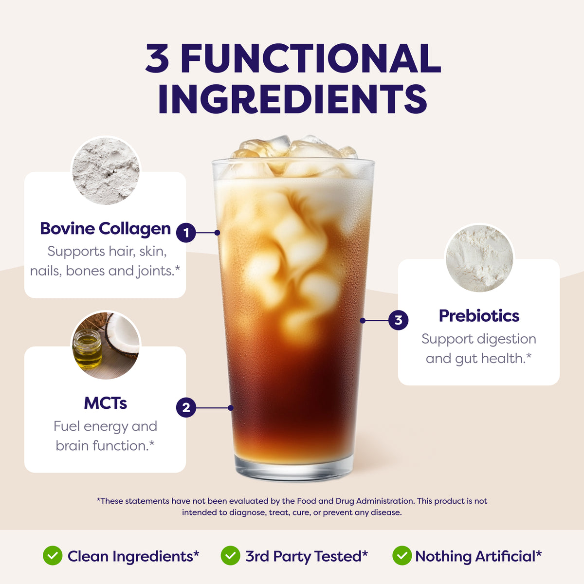 Bovine Collagen, Sunflower Oil Creamer, Natural Flavor, Purified Acacia Hydrolysate (as Sukré®), Medium-Chain Triglycerides (as goMCT®), Reb M (as OnoSweet™)